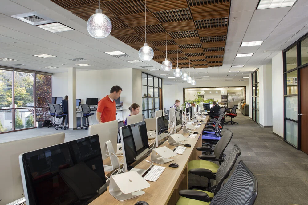 An open floor plan echoes this nonprofit’s mission to foster an open exchange of ideas, with a casual, contemporary style that supports collaboration.