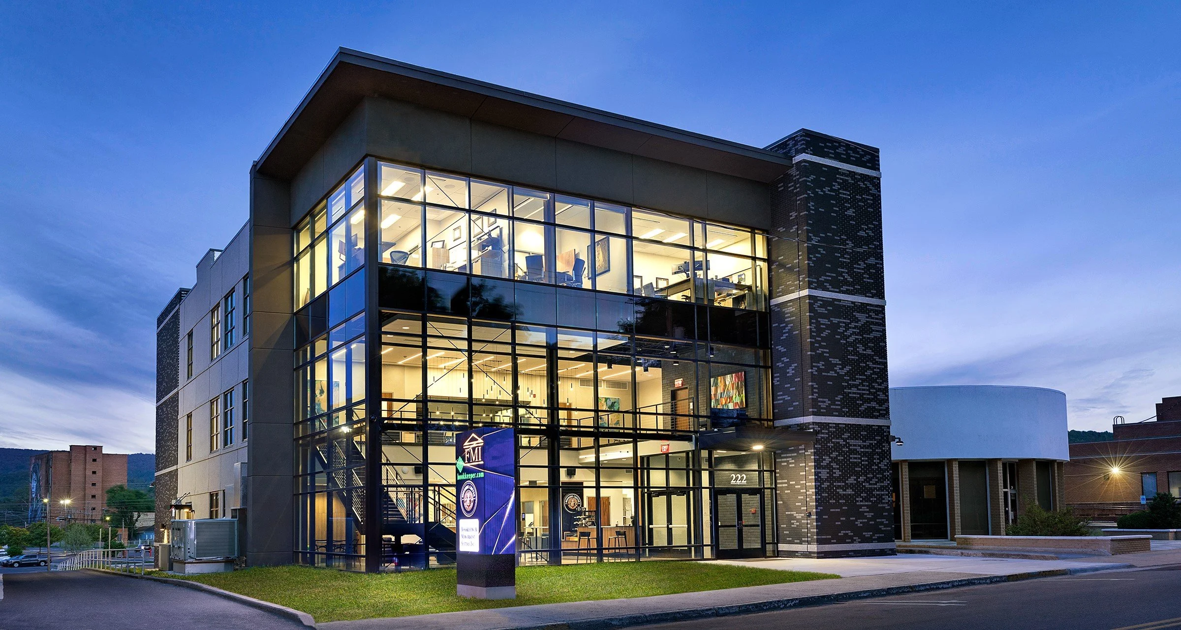 A 2-story atrium serves as the focal point for this progressive headquarters building in a refined industrial style. Featuring a floating metal stair with cable railing and a coffee kiosk, it invites employees and the outside community to spend time in this dramatic, light-filled space.